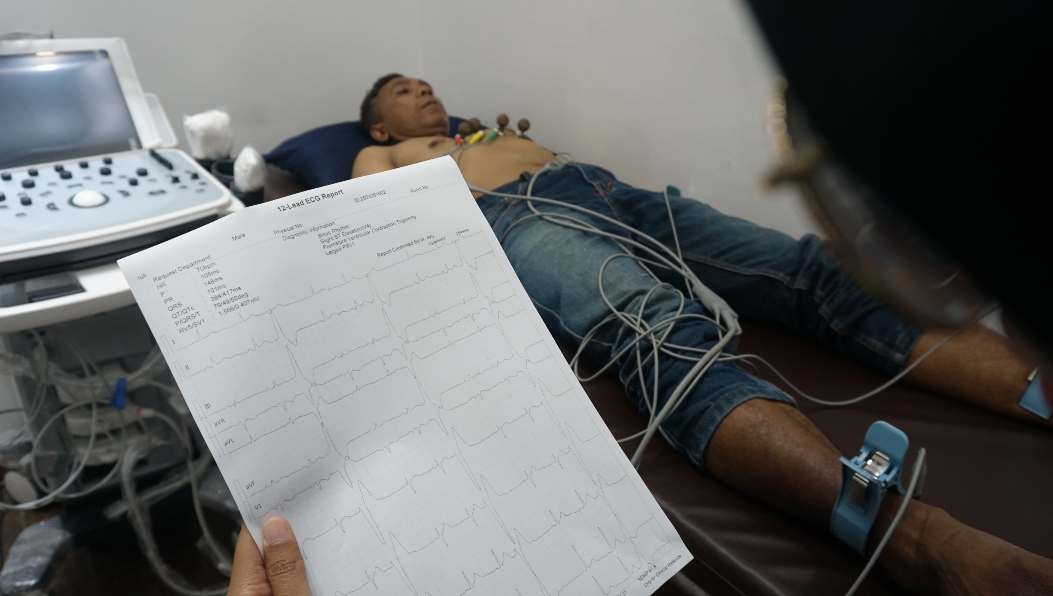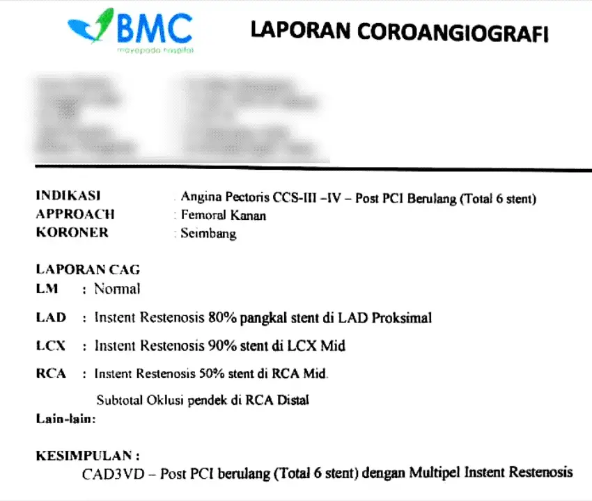 Terlihat dari hasil pemeriksaan angiografi terdapat penyempitan kembali (restenosis) pada ke-tiga ring jantung yang pernah dipasangkan pada pasien tersebut.